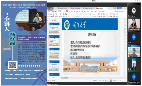2022年10月30日16点,教育科学学院产学研联合培养研究生示范基地(以下简称基地)邀请了深圳大学硕士生导师、教授,深圳市盐田区教科院科研教研员杨江峰博士,通过腾讯会议线上形式,做了主题为“深度·增值教学流派的理论与实践”的专题教育讲座。讲座由李双龙教授主持,刘健院长致欢迎辞并介绍参会嘉宾。参会嘉宾来自基地师生和基地共建学校的领导与教师,主要有:喀什市第三中学陈晓霞书记和常学珍副校长、喀什市第二十八中学陈晓江书记和贾江丽等副校长、喀什市第十小学张丽校长和陈玲副校长、喀什市第十三小学时桂玲书记和于浩兰副校长、疏附县托克扎克镇中心小学姚红玉书记和靳善瑞主任、喀什大学附属中学杨绪交副科长等领导和各学校一线教师,以及喀什大学教科院教师和硕士研究生等。